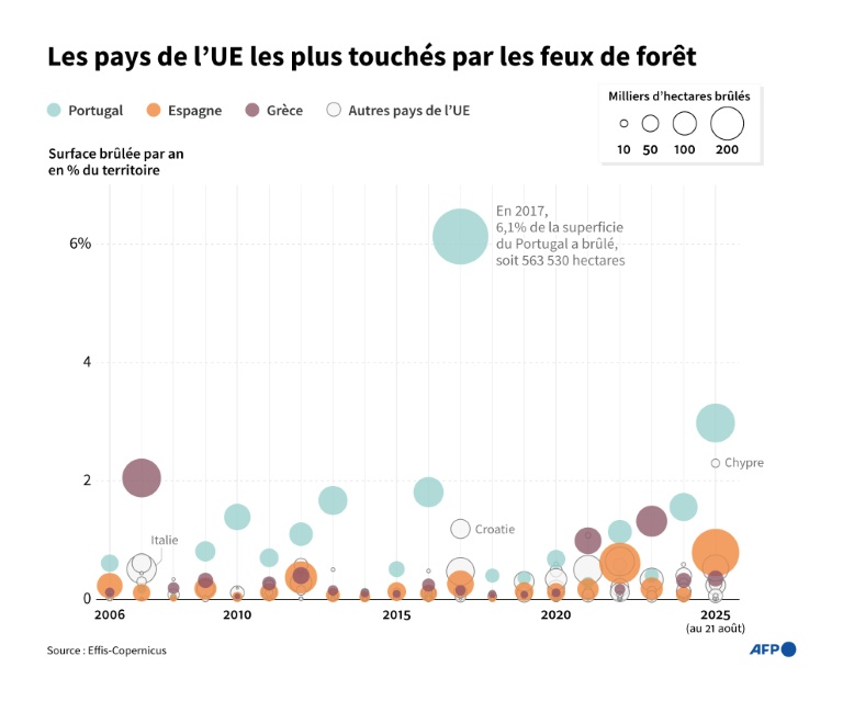 Les zones brûlées dépassent pour la première fois un million d'hectares dans les pays de l'Union européenne depuis début 2025, une première depuis le début des statistiques en 2006, selon les données du Système européen d'information sur les incendies de forêt (EFFIS) analysées par l'AFP.