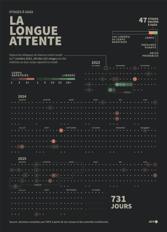 Les efforts des médiateurs ont jusqu'à présent échoué à aboutir à un cessez-le-feu durable. Deux précédentes trêves en novembre 2023 et début 2025 avaient permis le retour d'otages ou de corps de captifs en échange de prisonniers palestiniens.