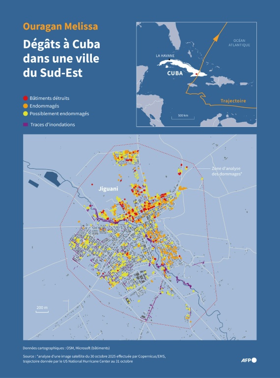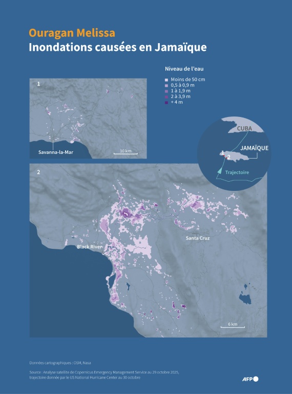 Habitations en ruines, quartiers inondés et communications coupées... L'heure est à l'évaluation des dégâts causés par Melissa. Et l'aide internationale afflue vendredi vers les Caraïbes dévastées.Rendu plus destructeur par le réchauffement climatique, l'ouragan a été le plus puissant à toucher terre en 90 ans lorsqu'il a frappé la Jamaïque mardi en catégorie 5, la plus élevée sur l'échelle Saffir-Simpson, avec des vents d'environ 300 km/h.
