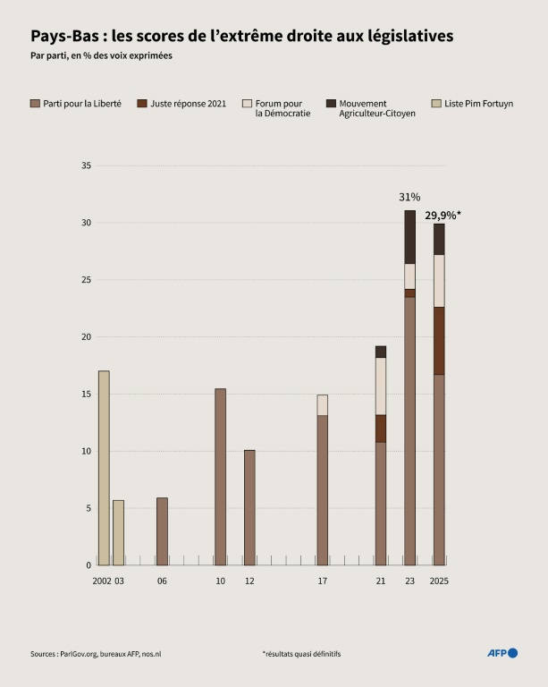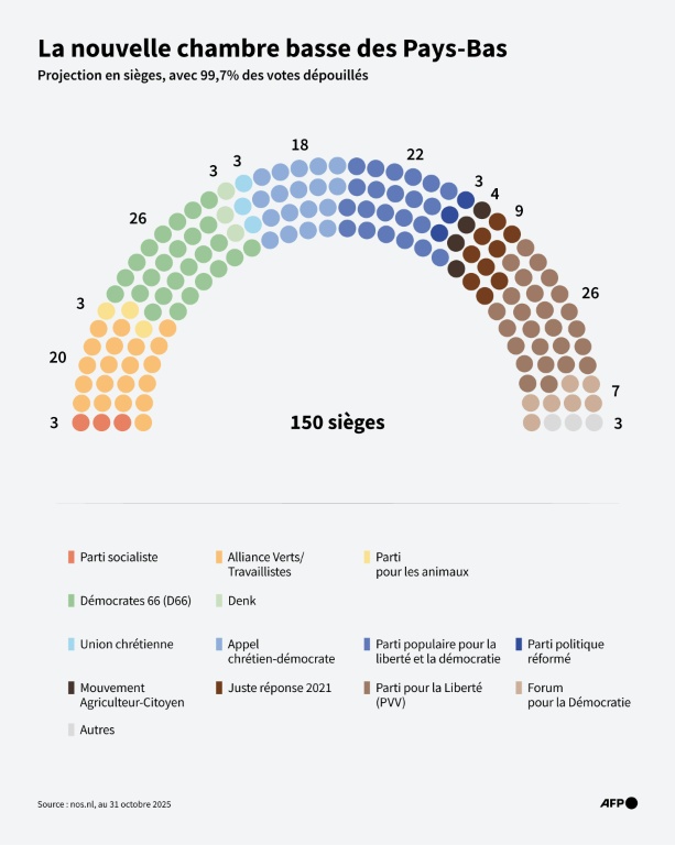 Le parti D66 de M. Jetten compte a priori 26 sièges, mais ce nombre pourrait passer à 27 une fois tous les votes comptabilisés, ouvrant potentiellement de nouvelles possibilités de coalition.